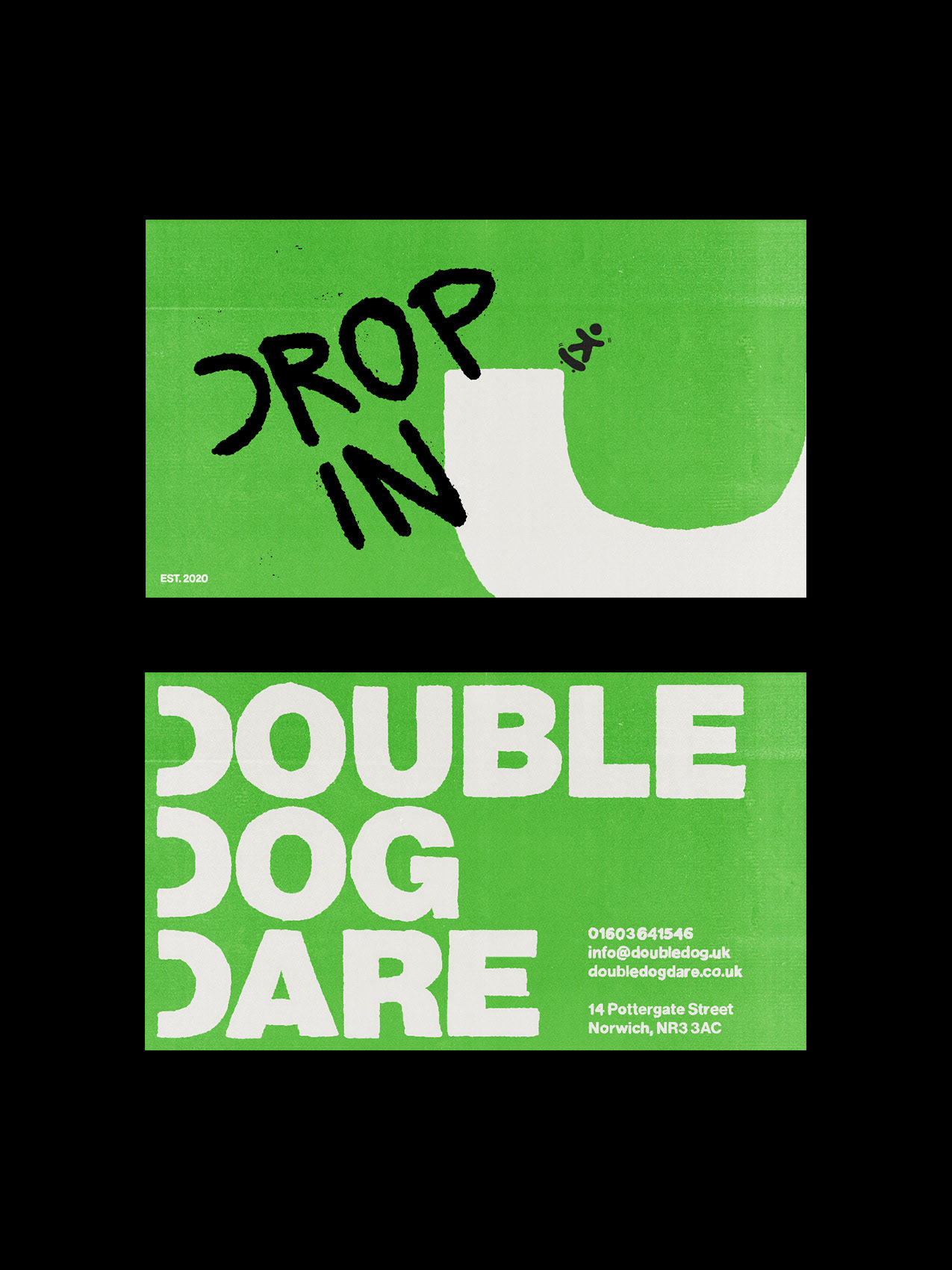 Double Dog Dare is a fictitious local Skate Shop based in Norwich. The branding & identity is heavily inspired by the daring attitudes of skaters, and their courage to stand out and be different. This is highlighted by the striking shade of green and simplicity of the design.